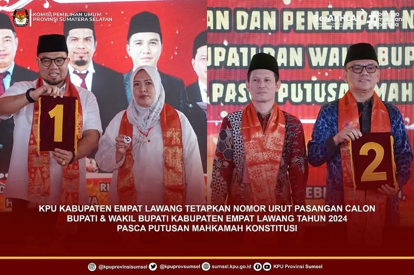 Kemarin, Minggu (23/3/2025) mulai pukul 13.00 WIB telah dilakukan rapat pleno Pengundian Nomor Urut Pasangan Calon Bupati dan Wakil Bupati Empat Lawang Tahun 2024. Hal ini menindaklanjuti pasca Putusan Mahkamah Konstitusi di halaman Kantor KPU Empat Lawang, yang terletak di Jalan Poros Tebing Tinggi – Pendopo.